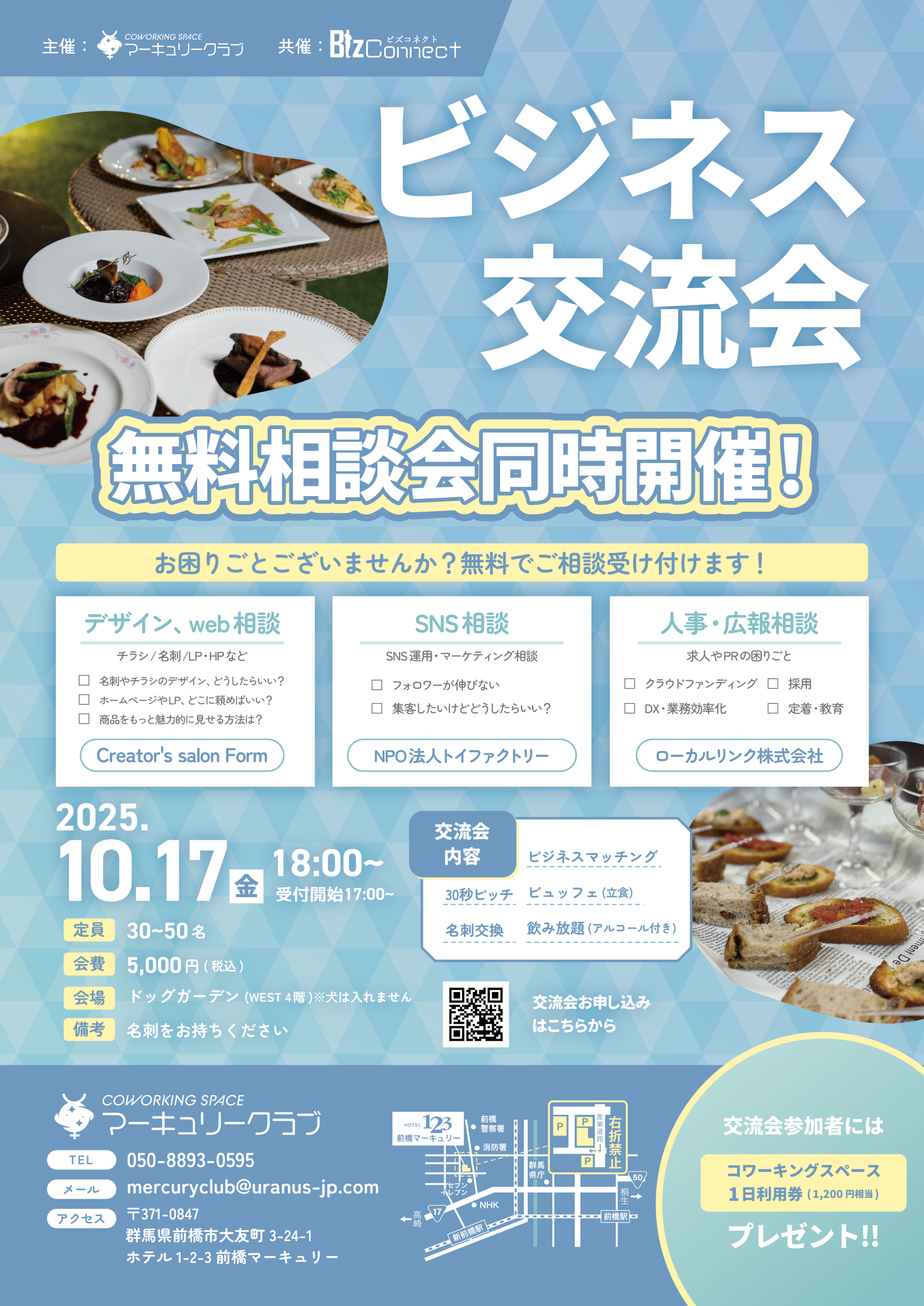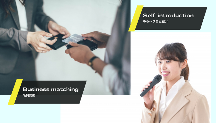 無料相談会/30秒ピッチ/名刺交換(ビジネスマッチング)/立食バイキング/飲み放題(アルコール付き)/コワーキングスペース1日利用券プレゼント