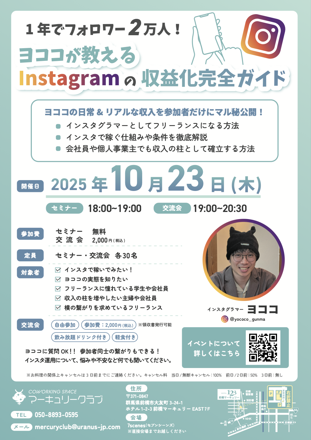 グルメインフルエンサー「ヨココ」によるInstagram収益化セミナーです。